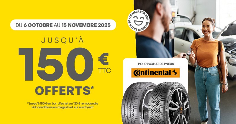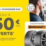 Du 6 octobre au 15 novembre 2025, profitez de l’offre Continental jusqu’à 150€ offerts* en bon d’achat ou 120€ remboursés.